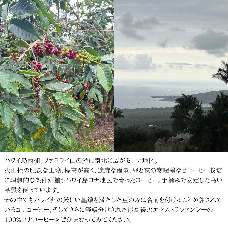 火山性の肥沃な土壌、標高が高く、適度な雨量、昼と夜の寒暖差などコーヒー栽培に理想的な条件が揃うハワイ島コナ地区で育ったコーヒー。