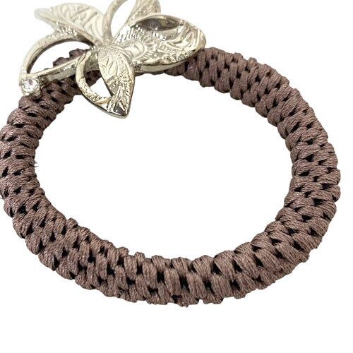 プルメリアにハワイアンジュエリー調の刻印を施したヘアゴム。腕につけても素敵です。