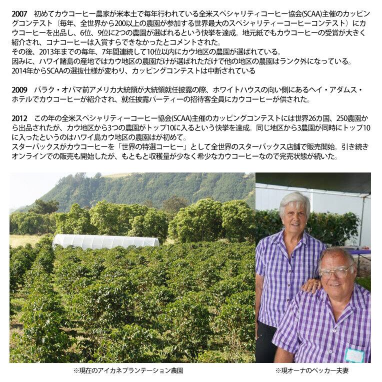2007年には、初めてカウコーヒー農家が米本土で毎年行われている全米スペシャリティーコーヒー協会(SCAA)主催のカッピングコンテスト(毎年、全世界から200以上の農園が参加する世界最大のスペシャリティーコーヒーコンテスト)にカウコーヒーを出品し、6位と9位に2つの農園が選ばれるという快挙を達成。