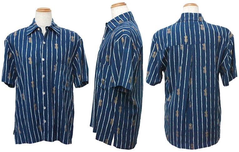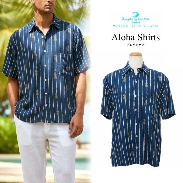 Angels by the Sea Hawaii メンズ アロハシャツ パイナップルプリントシャツ ネイビー Sサイズ