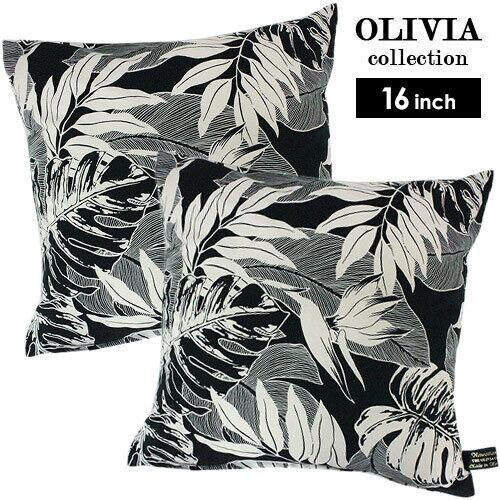 ハワイ クッションカバー オリビアコレクション ファーン モンステラ ブラック クリーム 16inch 46