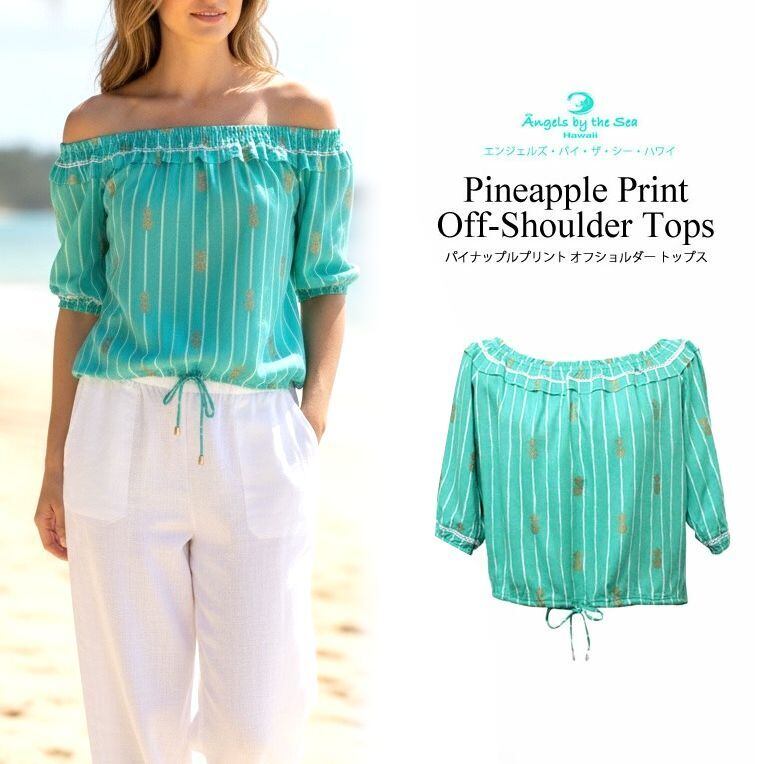 Angels by the Sea Hawaii ペケトップ パイナップルプリント オフショルダー トップス グリーン