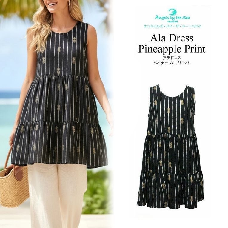 Angels by the Sea Hawaii アラドレス パイナップルプリント 2段ラッフルヘム ショートドレス ブラック 黒 チュニック トップス ショートワンピース