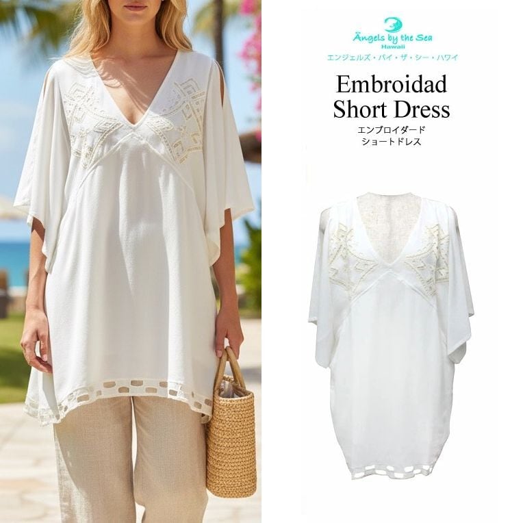 Angels by the Sea Hawaii エンブロイダードショートドレス スリットスリーブ ホワイト 白 ショートワンピ チュニック