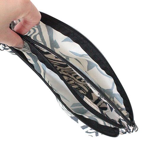 2つのポケットに分かれたブック型のポーチ。スナップボタンで開閉可能です。