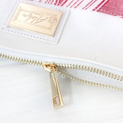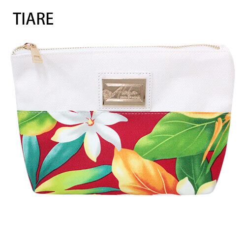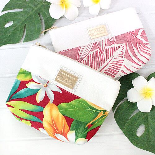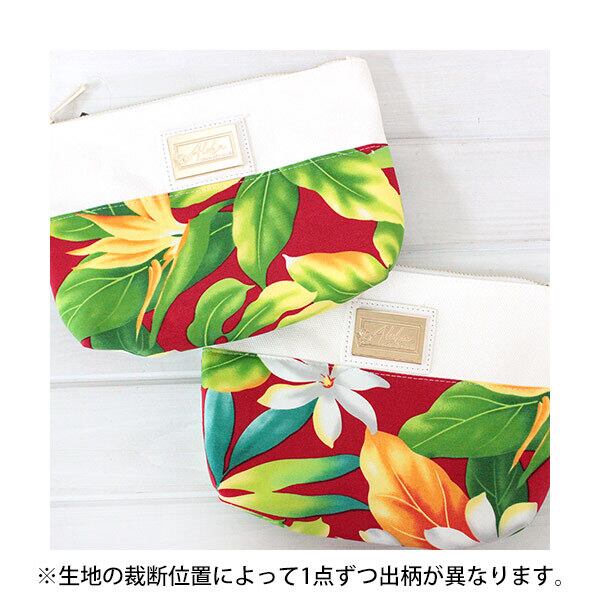 HAWAIIから輸入した生地を使用したポーチ。オリジナルのタグが付きます。収納も沢山あるので便利です。生地の裁断位置によって出柄が異なります。
