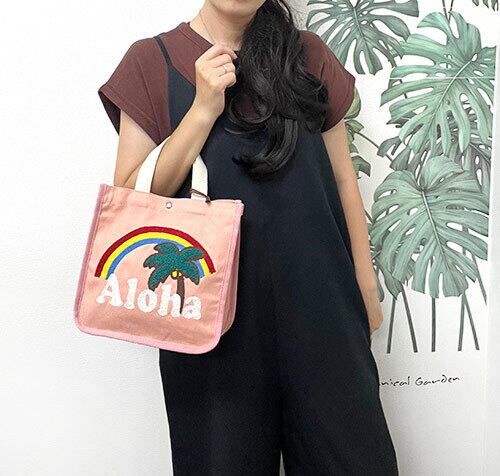 HAWAIIを感じられるモチーフを大胆に相良刺しゅうで表現したカラフルなバック。
