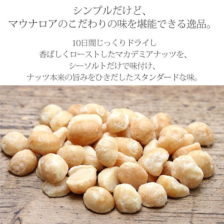 10日間じっくりドライし香ばしくローストしたマカデミアナッツを、シーソルトだけで味付け、ナッツ本来の旨みをひきだしたスタンダードな味。シンプルだけど、マウナロアのこだわりの味を堪能できる逸品。